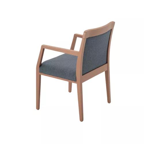 Dubai A is een gestoffeerde stoel met armleuningen, zitting en rugleuning. Het frame is van beukenhout, gelakt met polyurethaan en beschikbaar in verschillende beitskleuren. De bekleding is mogelijk in professionele stoffen of kunstleer, ideaal voor intensief horeca-gebruik. Dankzij zijn vele personalisatiemogelijkheden past hij in elke interieurstijl.