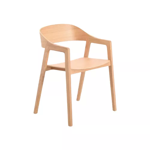 Modern eiken stoel met geïntegreerde armleuningen en een vloeiend gevormde rugleuning. Gemaakt van hoogwaardig massief eikenhout, biedt deze stoel elegantie en duurzaamheid, perfect voor veeleisende HoReCa-omgevingen. Ontworpen om moderne eet- en loungeruimtes te verrijken met comfort en stijl.
