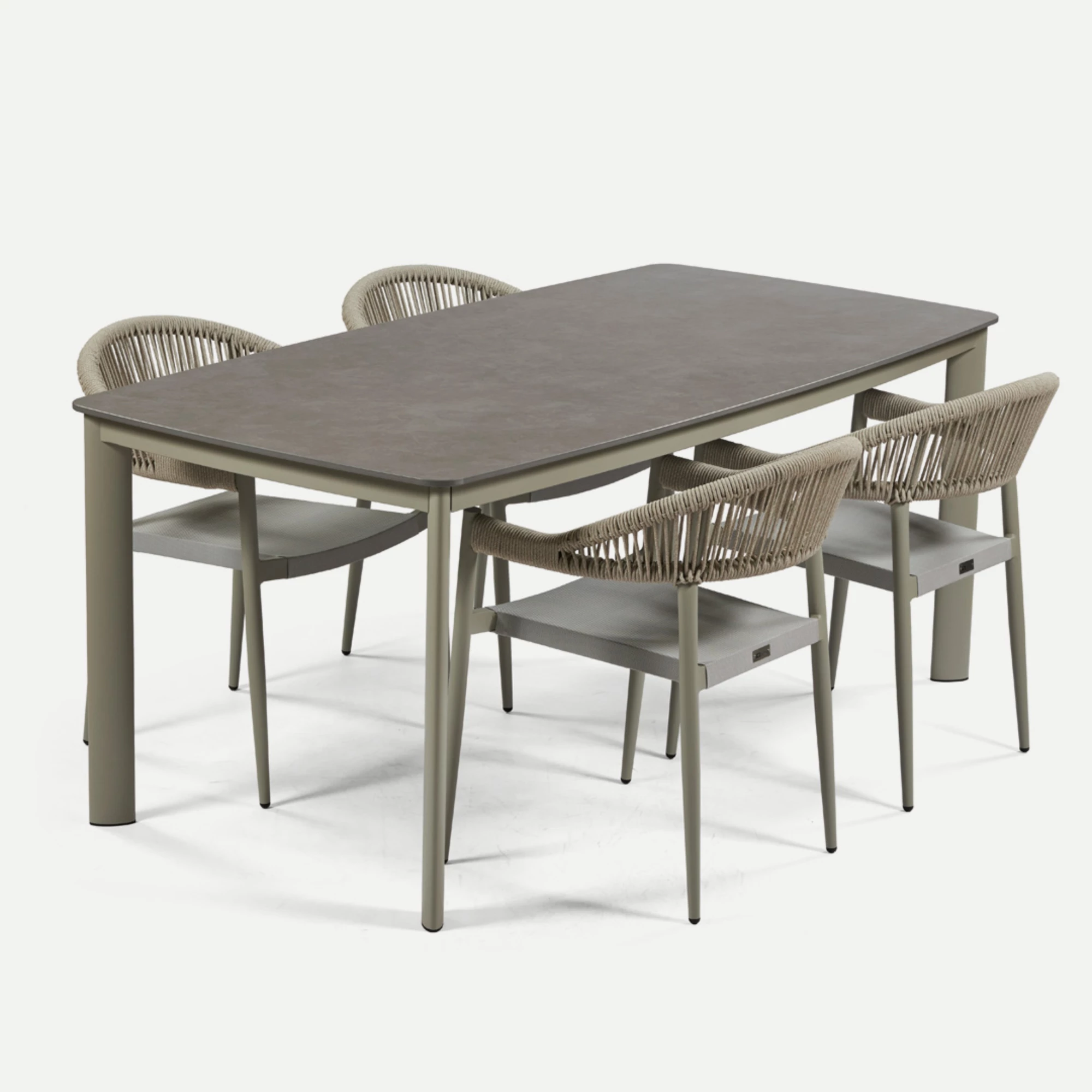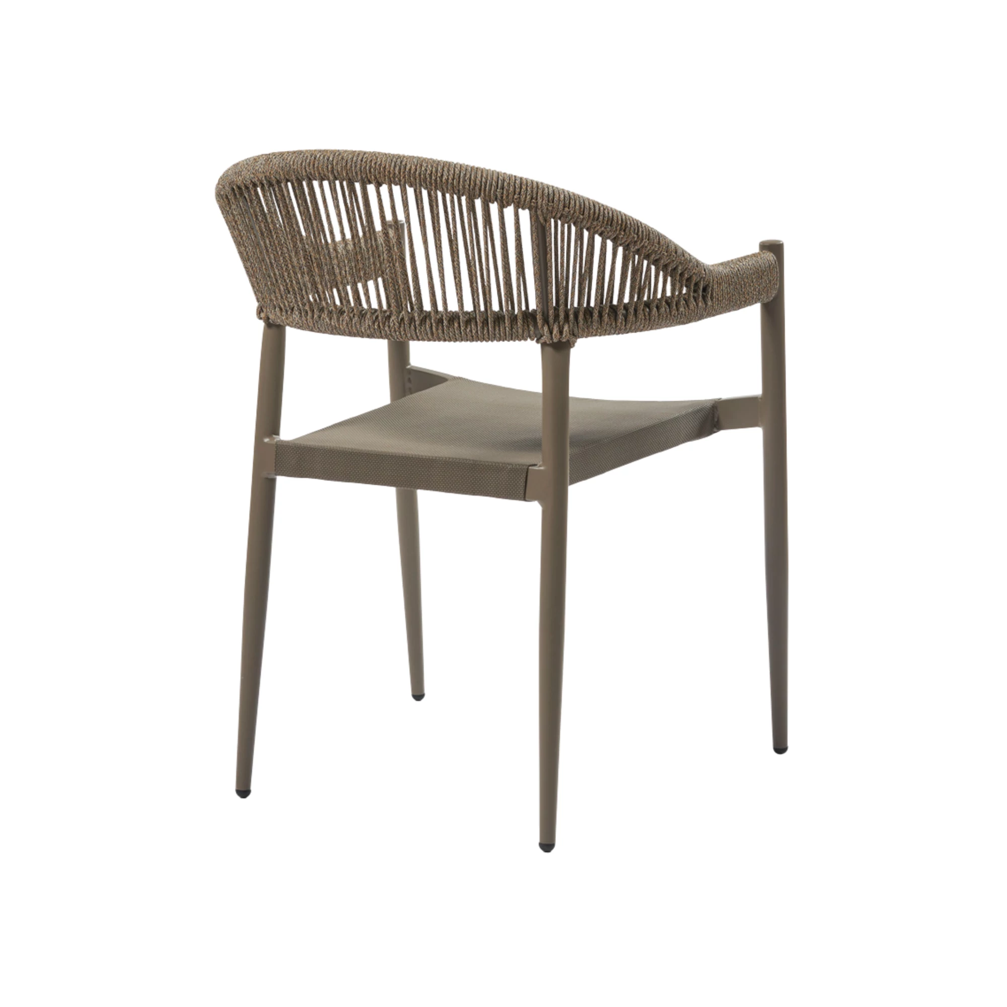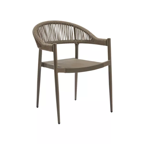 Buitenarmstoel met een opvallend ontwerp, met een rugleuning gevlochten uit stevig touw en een geperforeerde zitting voor extra comfort en ventilatie. Ideaal voor terrassen, tuinen en horecaruimtes in de buitenlucht. Afmetingen: 57x58x76 cm.
