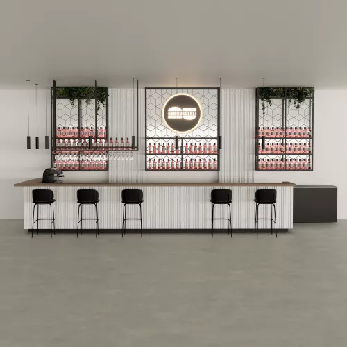 Een fris en eigentijds barconcept met strakke lijnen, natuurlijke warmte en sculpturale texturen.