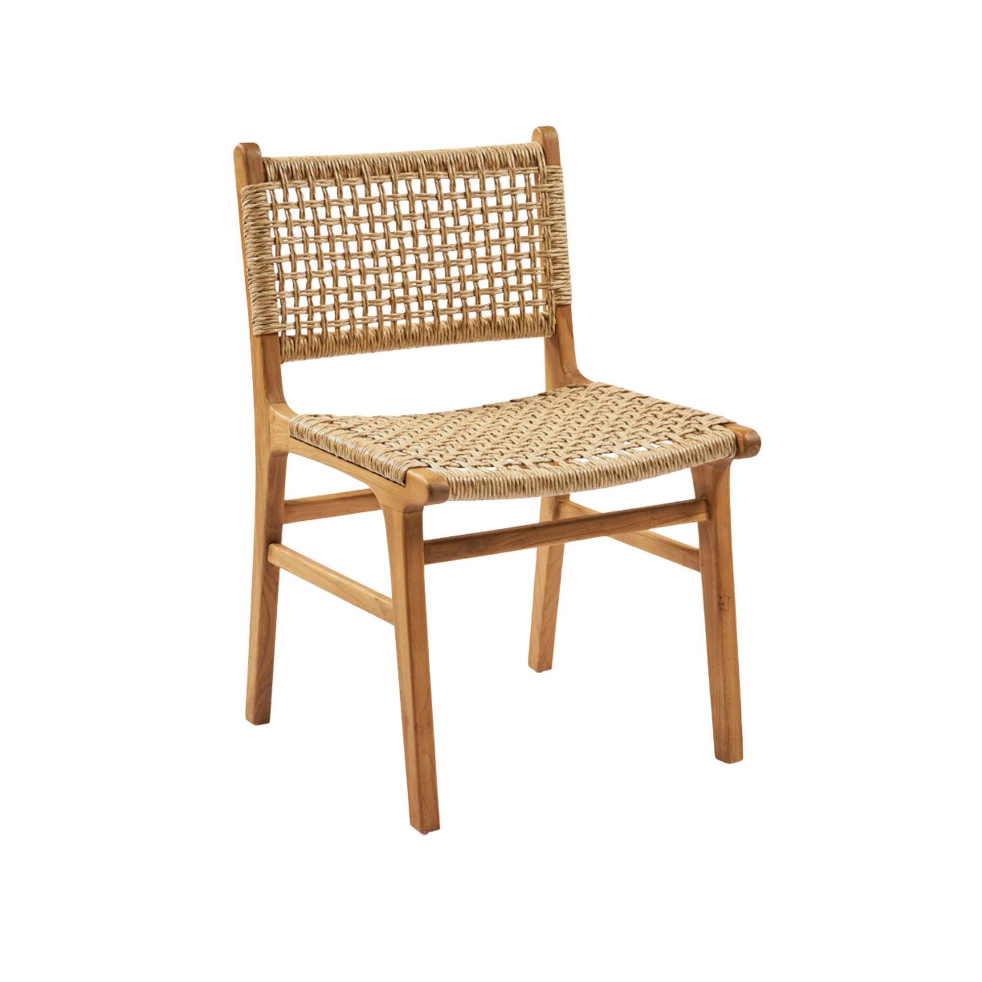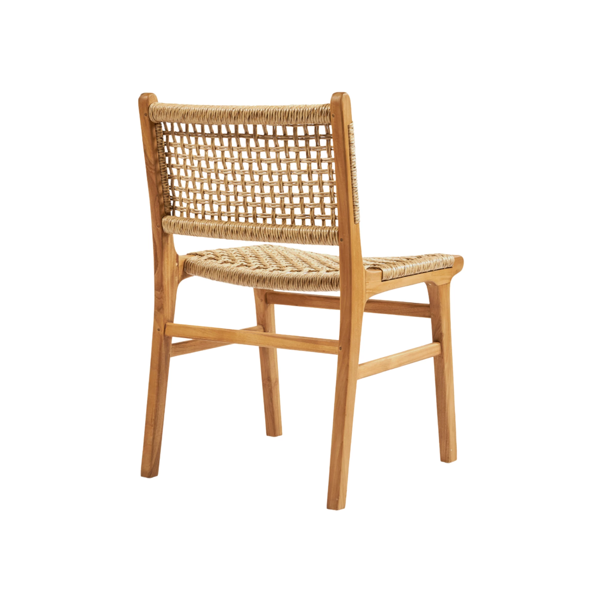 Stoel gemaakt van teakhout met een zitting en rugleuning gevlochten uit synthetisch rotan. De combinatie van massief hout en duurzaam vlechtwerk zorgt voor een natuurlijke uitstraling en maakt de stoel geschikt voor horeca-interieurs en terrassen.