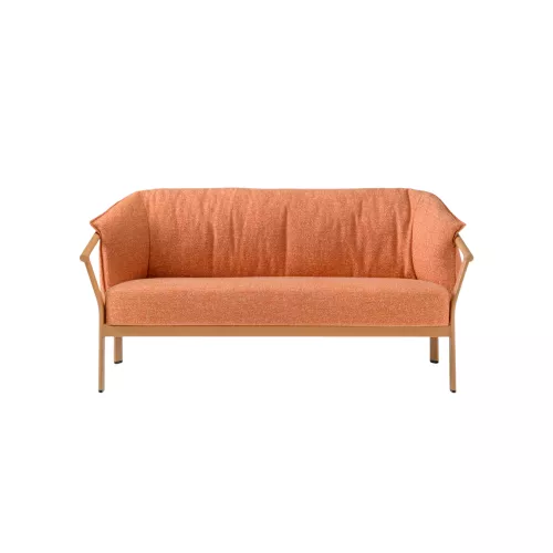 Een verfijnde tweezitsbank voor buiten, ontworpen rond een prachtig contrast: een strak, ingetogen frame met een zacht, royaal en uitnodigend kussen. De geëxtrudeerde aluminium constructie heeft ovale poten die naadloos aan ronde armleuningen zijn gelast, wat een strak en stabiel silhouet creëert.