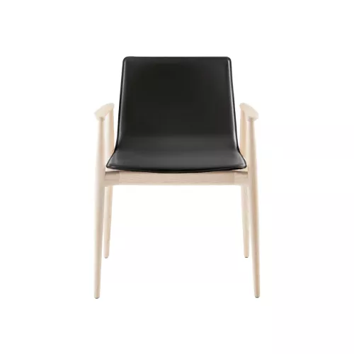 De Malmö 397 fauteuil straalt aangename warmte uit dankzij het essenhout, het taps toelopende silhouet en de klassieke uitstraling. De kuip van echt leer rust op een stevig essenhouten frame en armleuningen, met subtiel verstevigde, naar de randen toe vernauwende verbindingen. Zo ontstaat een binnenfauteuil die degelijke ondersteuning combineert met een luchtige elegantie. Verkrijgbaar in diverse leerkleuren, past de Malmö 397 moeiteloos in ieder interieur.