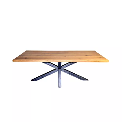 Tafel met een 2,8 cm dik blad van rustiek eiken en een dubbel X-frame van staal (8x8 cm).