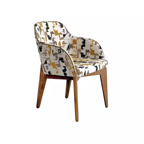 Romina Wood A is een comfortabele stoel met armleuningen, vervaardigd uit een beukenhouten frame en voorzien van een zachte bekleding. De stoffering is beschikbaar in diverse professionele stoffen of kunstleer, ideaal voor intensief gebruik in horecagelegenheden en stijlvolle interieurs.
