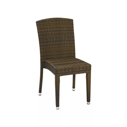 Titus Brown S is een stijlvolle outdoor stoel, ontworpen voor horeca. De gepoedercoate aluminium structuur en het zitvlak/rugleuning van plat P.E.-Wicker in gebrande kleur bieden UV- en weerbestendigheid. Stapelbaar tot 8 stuks. Optioneel zitkussen beschikbaar.